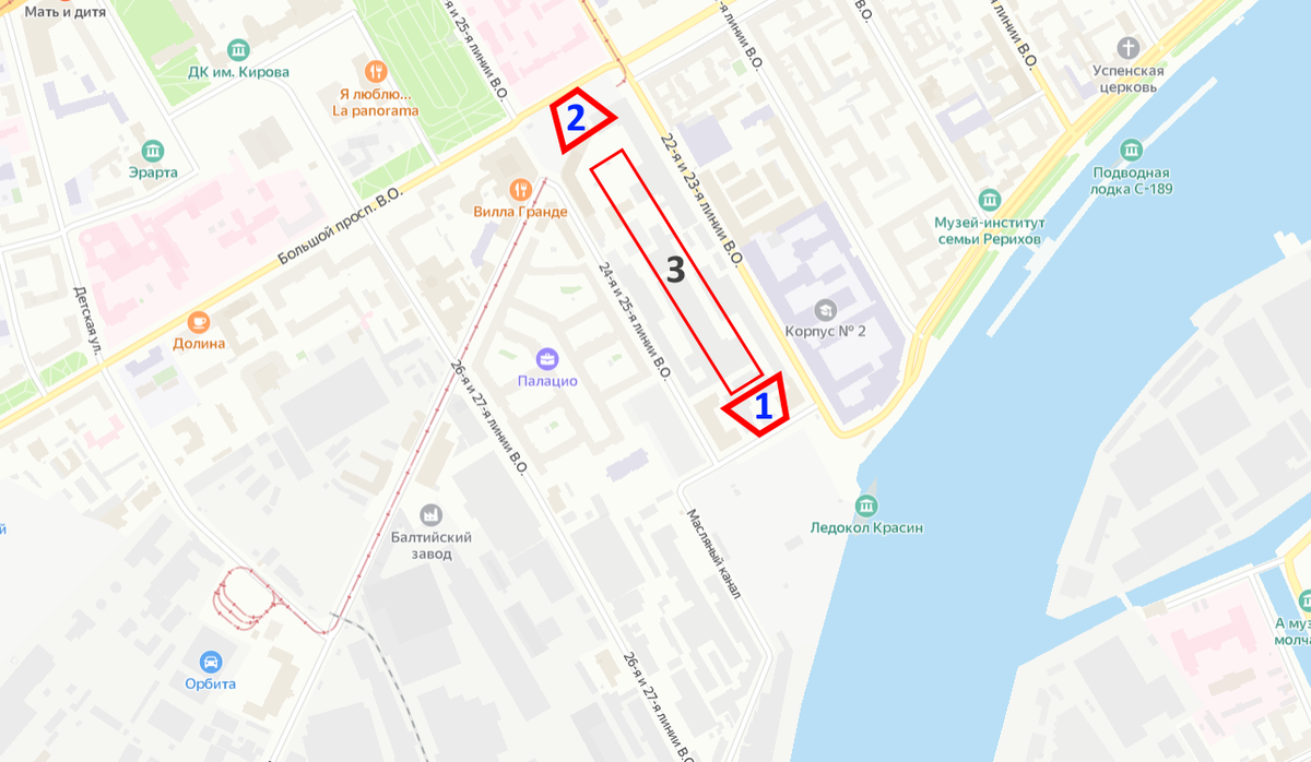 Планируется, что станция будет иметь два вестибюля: первый появится в районе пересечения Большого проспекта и 24—25-й линий Васильевского острова, второй — недалеко от перекрёстка 23-й линии и Масляного канала.
