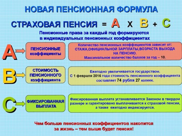 Страховая пенсия состоит из страховой и фиксированной выплат. Для расчета учитываются трудовые периоды, размер заработной платы, год выхода на пенсию, индивидуальный пенсионный коэффициент (ИПК), стоимость пенсионного коэффициента, фиксированная выплата. Пенсию рассчитывают по формуле: СП = ИПК ? СПК + (ФВ ? КПФВ).