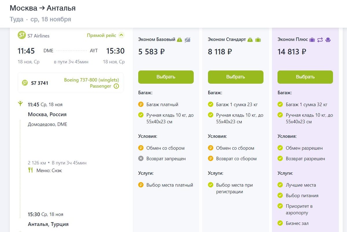 У тарифа Эконом Базовый есть платные опции: выбор места при покупке или регистрации – 300 рублей, платный багаж – одно место до 23 кг обойдется в 2000 руб. Владельцам карт лояльности от серебряного уровня One World – Silver Ruby и S7 Приоритет сохраняются нормы провоза бонусного багажа: 1 место и вес до 23 кг.