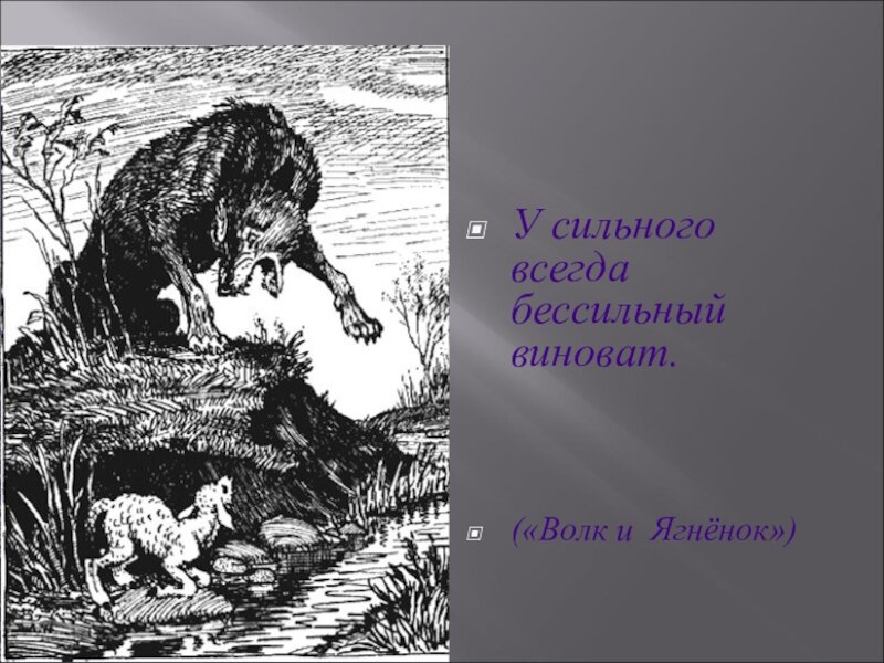 У сильного всегда бессильный виноват… Волк и Ягненок – одна из редких басен, начинающихся с морали. Крылов сразу настраивает нас на то, о чем пойдет речь. Бытующее мнение, что мол кто сильнее, тот и прав показывается во всей красе. 19 февр. 2019 г.