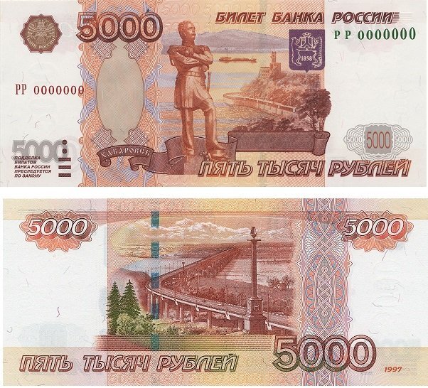 Купюра номиналом 5000 рублей Банка России n nКупюра 5000 рублей - это самая большая банкнота в России. n nНедостаточное знание признаков подлинности купюры или невнимательное отношение к ним оборачивается для нас материальными потерями, особенно если учитывать, что это самая крупная по наминалу купюра. n nБанк России периодически совершенствует купюры, усиляя защитные функции, по этому на сегодняшний день в обращении имеется два два вида банкнот номиналом 5000 рублей: n## 5000 рублей образца 1997 года - находится в обращении с 2006 года. n## 5000 рублей образца 1997 года (модификация 2010 года) - находится в обращении с 2011 года. n nДля того, чтобы свести риск получения фальшивой купюры к минимуму, лучше всего проверить не менее трех или даже пяти защитных признаков подлинности купюры n nОписание и размер купюры в 5000 рублей n nРазмер купюры - 157х69 mm. Преобладает красно-коричневый цвет купюры, а в бумагу встроены волокна красного, светло-зеленого, а также серого цветов, имеются чередующиеся волокна красного и синего цветов. Пятитысячная купюра посвящена городу Хабаровску. n##Лицевая сторона имеет рисунок с видом на набережную Хабаровска, а также памятник Муравьеву-Амурскому, который установили в 1891 году. В правой верхней части купюры нарисован герб города Хабаровска. n## Обратная сторона имеет изображение вида на мост через реку Амур в Хабаровске. n n5000 рублевая банкнота образца 1997 г. nПризнаки подлинности данной купюры: n n1. Три водяных знака, расположенные на купонных полях: n## узкое поле цифровое изображение номинала, n##широкое поле голова памятника Муравьеву-Амурскому, а также число 5000, которое выполнено с помощью филиграни. n nЕсли смотреть на купюру на просвет, видны более темные и более светлые участки. На широком поле можно увидеть плавные переходы от темного к светлому. n n2. Ныряющая металлизированная защитная нитка с голографическим покрытием. Ширина нити составляет 3 mm, а обратная сторона имеет 5 участков, выходящих на поверхность. На просвет защитная нить выглядит в виде темной полосы с ровными краями и имеет повторяющиеся светлое число 5000 как в прямом, так и в перевернутом зеркальном отражении. n nЭто видео создано с помощью видеоредактора YouTube (