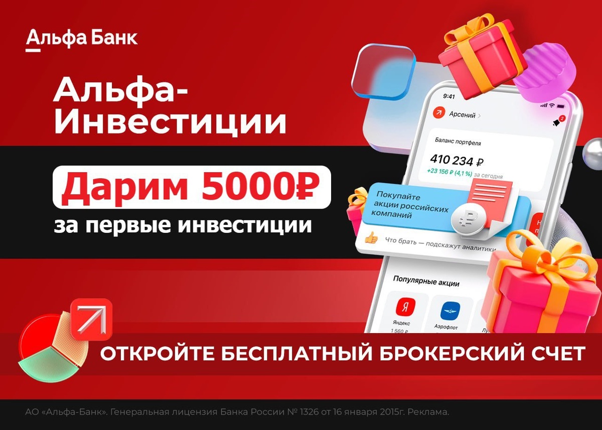 Альфа банк дарит до 5000 рублей КАЖДОМУ за открытие ПЕРВОГО брокерского счёта