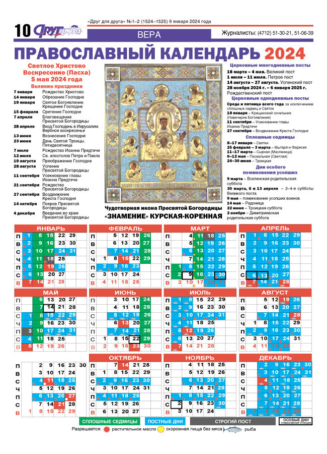 Новый Православный Церковный Календарь на 2024 год со всеми Великими Праздниками и Постами