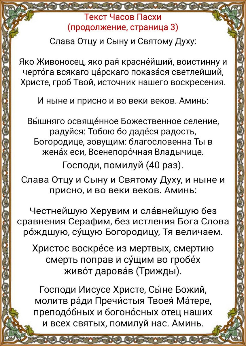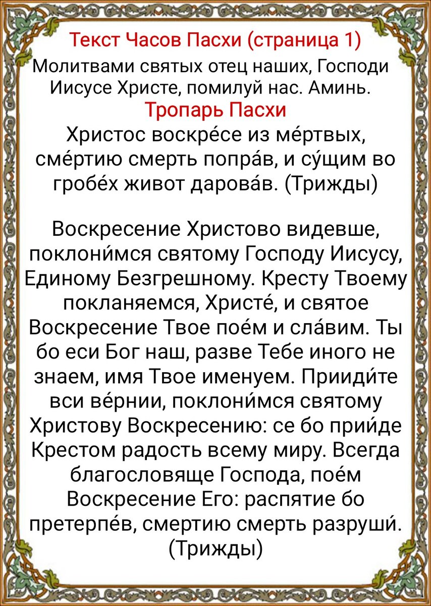 Православные молитвы на Пасху дома, очень полезны тем, кто не может сам читать или нет возможности в суете житейских дел. Читаются молитвы в Пасхальную седмицу, которая, также называется Светлой седмицей. Чтец: Бровко В.И., Московский Сретенский монастырь. Пасхальные часы, Часы Святой Пасхи — многократно пропеваемая часть пасхального православного богослужения, замещающая собой в дни пасхальной седмицы Первый час, Третий час, Шестый час, Девятый час, Повечерие, Полунощницу, Утренние молитвы и Вечерние молитвы. В отличие от обычных часов (церковных служб), Пасхальные часы никогда не изменяются, не содержит псалмов и покаянных молитв (кроме Господи помилуй). Как и все пасхальные чинопоследования, Пасхальные часы исполнены радости и благодарения Христу Богу. Вначале иерей возглашает: «Благослове?н Бог наш всегда?, ны?не и при?сно и во ве?ки веко?в», а при его отсутствии мирянин начинает чтение словами: «Моли?твами святы?х оте?ц на?ших, Го?споди Иису?се Христе? Бо?же наш, поми?луй нас.» Далее всё кроме возгласа и отпуста священника поётся «Ами?нь.» Тропарь Пасхи: «Христо?с воскре?се из ме?ртвых, сме?ртию сме?рть попра?в и су?щим во гробе?х живо?т дарова?в.» (трижды) Воскресная песнь, глас 6: «Воскресе?ние Христо?во ви?девше, поклони?мся Свято?му Го?споду Иису?су,..» (трижды) Ипакои, глас 8: «Предвари?вшия у?тро я?же о Марии?, и обре?тшия ка?мень отва?лен от гро?ба,..» Кондак, глас 8-й: «А?ще и во гроб снизше?л еси, Безсме?ртне, но а?дову разруши?л еси? си?лу,..» Также и тропари, глас тот же: «Во гро?бе пло?тски, во а?де же с душе?ю я?ко Бог, в ра?и же с разбо?йником,..» «Сла?ва Отцу? и Сы?ну и Свято?му Ду?ху.» «Я?ко Живоно?сец, я?ко ра?я красне?йший, вои?стинну...» «И ны?не и при?сно и во ве?ки веко?в. Ами?нь.» «Вы?шняго освяще?нное Боже?ственное селе?ние, ра?дуйся,..» «Го?споди, поми?луй» (40 раз) «Сла?ва Отцу? и Сы?ну и Свято?му Ду?ху. И ны?не и при?сно и во ве?ки веко?в. Ами?нь.» «Честне?йшую Херуви?м и Сла?внейшую без сравне?ния Серафи?м,..» «И?менем Госпо?дним благослови?, о?тче.» «Моли?твами святы?х оте?ц на?ших, Го?споди Иису?се Христе? Бо?же наш, поми?луй нас.» «Ами?нь.» «Христо?с воскре?се из ме?ртвых, сме?ртию сме?рть попра?в и су?щим во гробе?х живо?т дарова?в.»(трижды) «Сла?ва Отцу? и Сы?ну и Свято?му Ду?ху, и ны?не и при?сно и во ве?ки веко?в. Ами?нь.» «Го?споди, поми?луй» (трижды) «Благослови?.» Священник произносит отпуст: «Воскресы?й из ме?ртвых Христо?с, и?стинный Бог наш,..» «Ами?нь.» «Христо?с воскре?се из ме?ртвых, сме?ртию сме?рть попра?в и су?щим во гробе?х живо?т дарова?в.»(трижды) «И нам дарова? живо?т ве?чный, покланя?емся Его? тридне?вному Воскресе?нию.»[2] Предстоятель либо старший из мирян трижды восклицает: «Христо?с воскре?се!» Молящиеся трижды отвечают: «Вои?стину воскре?се!»