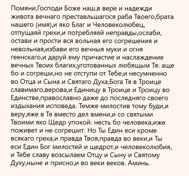 Упокой, Господи, душу раба Твоего (рабы Твоея, раб Твоих) новопреставленного (ой, ых) (имя), и прости ему (ей, им) вся согрешения его (её, их) вольная и невольная и даруй ему (ей, им) Царствие Небесное. Во имя Отца и Сына и Святаго Духа. Аминь.