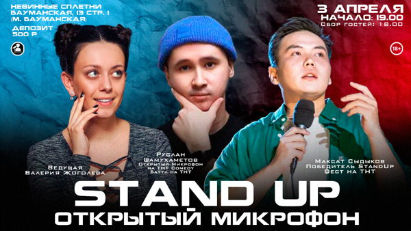 «Stand Up Открытый Микрофон» – это мероприятие, где выступаютn комики из популярных Stand Up шоу на ТВ и YouTube проверяют свои шутки. Продолжительность мероприятия — 1,5–2 часа.
