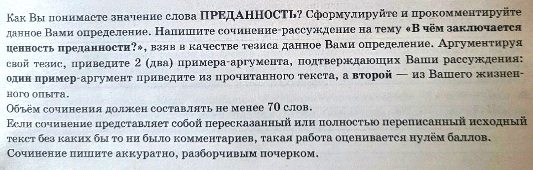 Объём сочинения должен составлять не менее 70 слов. Если сочинение представляет собой полностью переписанный или пересказанный исходный текст без каких бы то ни было комментариев, то такая работа оценивается нулём баллов. Сочинение пиши аккуратно, разборчивым почерком.