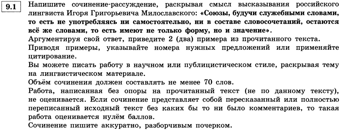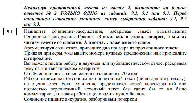 Ученикам 9-х классов для сочинения предоставляется 3 варианта: 9.1. публицистический/научный текст на тему лингвистики; 9.2. рассуждение на основе цитаты; 9.3. сочинение, раскрывающее значение словосочетания.
