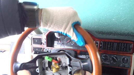 Для удобства откручивать стоит лицом к рулю, прижав коленями руль и сигнальный центр (Это предотвратить вероятность «слизывания болтов»), так удобней будет поймать центр болта и прилагать усилие под необходимым углом. После этих процедур, которые занимают 10 минут времени, руль окажется у Вас в руках.