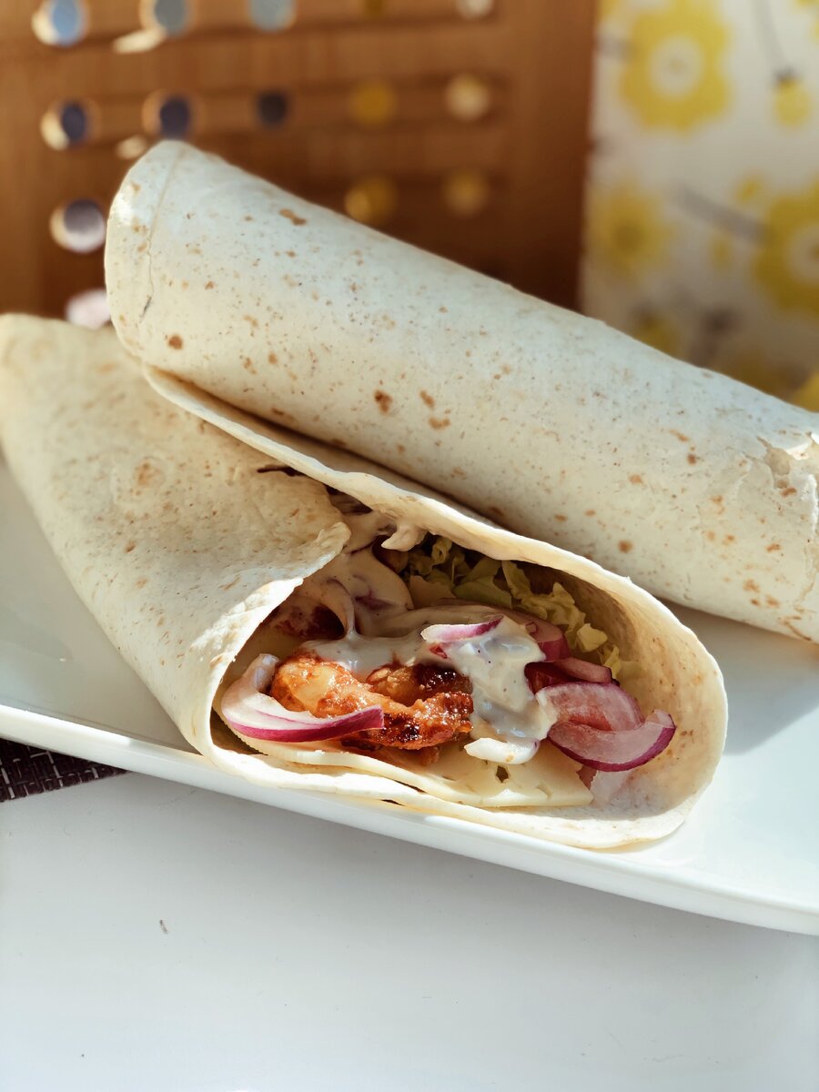 Шримп Ролл - нежные креветки в хрустящей панировке, свежий салат Айсберг и лук в пшеничной лепешке, заправленной специальным соусом.