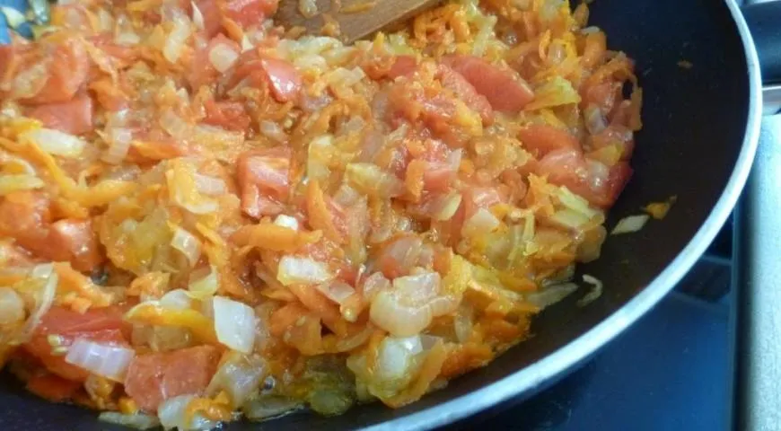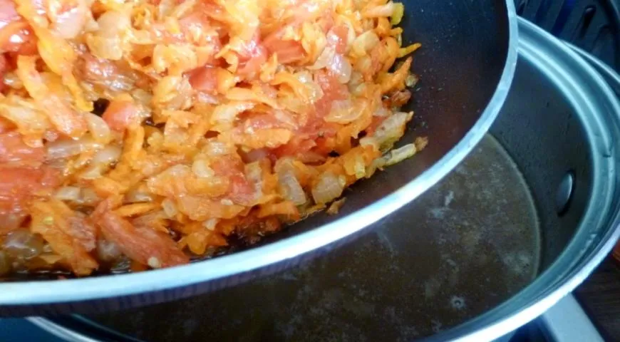 Влить в кастрюлю процеженный бульон, добавить до двух литров воды, довести до кипения и добавить капусту, картофель и пассерованные овощи. Варить около 15 минут. Если вы используете очень молодую весеннюю капусту, то сначала закладывайте картофель с пассерованными овощами, а уже минут через пять порезанную капусту.