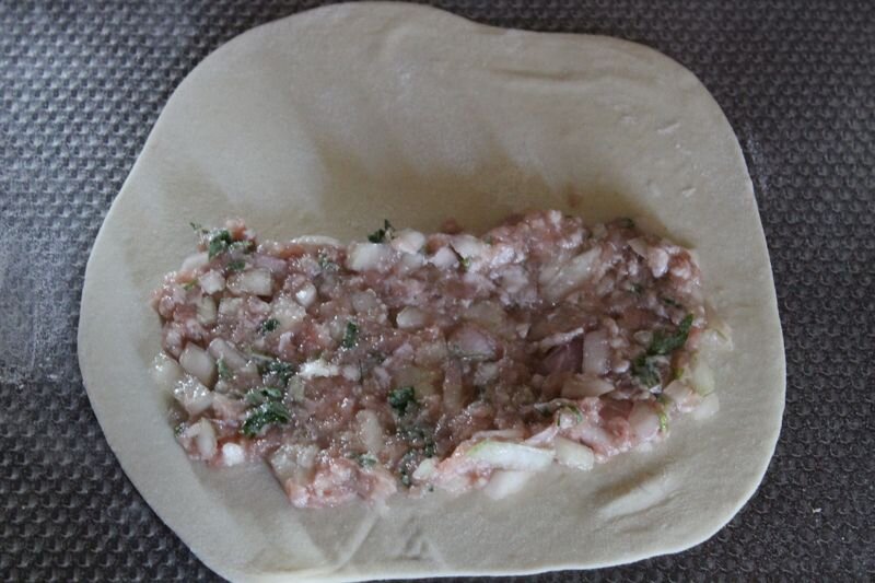 Начинка: Баранина фарш- 200 гр. Говядина фарш- 200 гр. Лук- 300 гр. Соль- 1 ч. л. Перец чёрный молотый- 1 ч. л. Паприка- 1 ч. л. Чеснок сушёный - 1 ч. л. Зира по вкусу- 1 щепотка Зелень по желанию - 10 гр. Масло для жарки - 800-1000 мл.