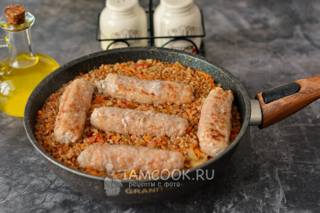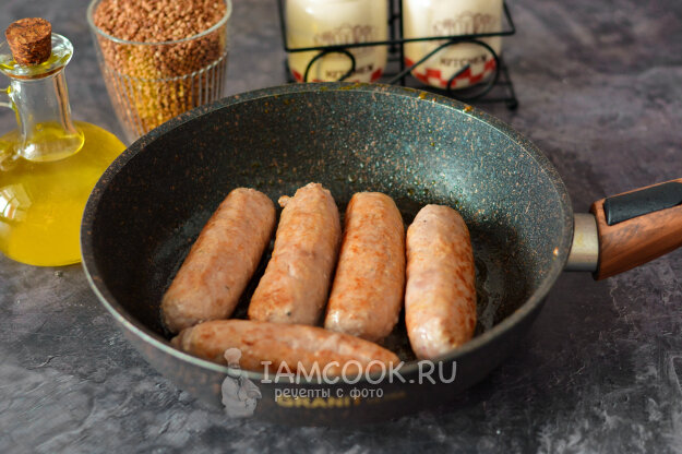колбаски – 500 г; гречка – 200 г; вода – 200-400 мл; лук репчатый – ? шт.; соль, специи – по вкусу; масло растительное – 1 ст. л.