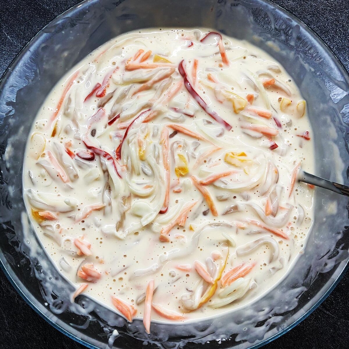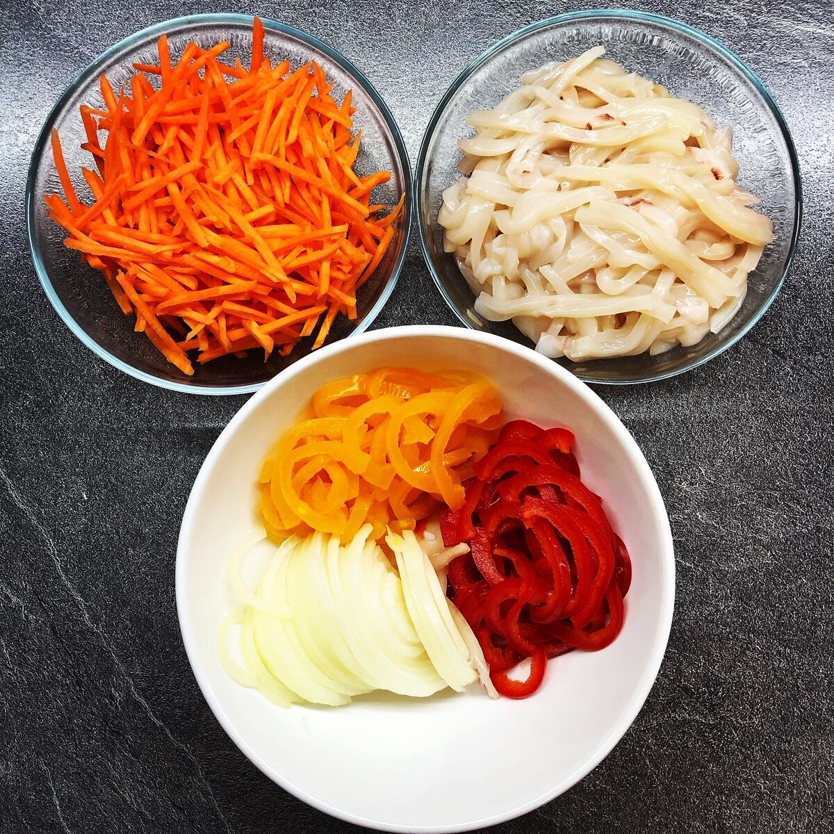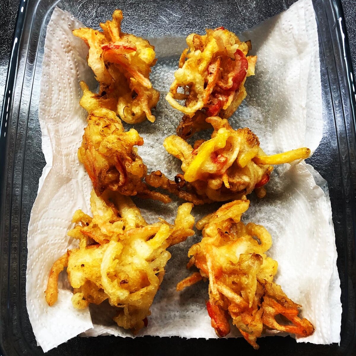 Темпура- это японское блюдо. Овощи, рыба или морепродукты в кляре. Но сахалинские корейцы так называют небольшие лепёшки из овощей и морепродуктов. Ингредиенты: - Кальмар -450 гр. - Морковь - 1 шт. - Лук зелёный - Мука - 200 гр. - Яйцо - 1 шт. - Вода холодная - 200 мл. - Крахмал - 1 ст. л. - Соль - 0,5 ч.л. - Растительное масло - примерно 0,5 л.